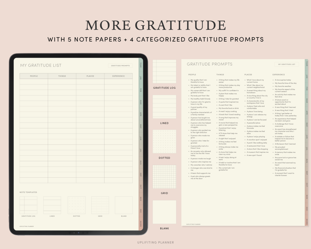 - 5 note templates(Gratitude log, lined, dotted, grid, blank) for more gratitude